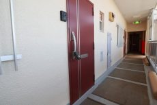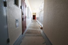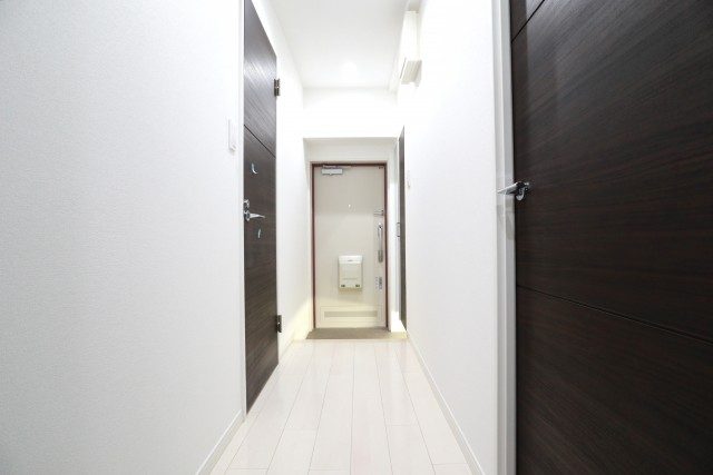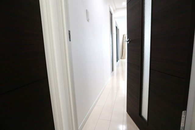 白い壁と、白い床、とても清潔感のあるシンプルな廊下です。