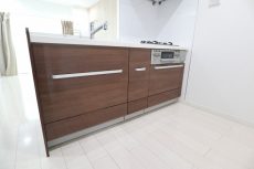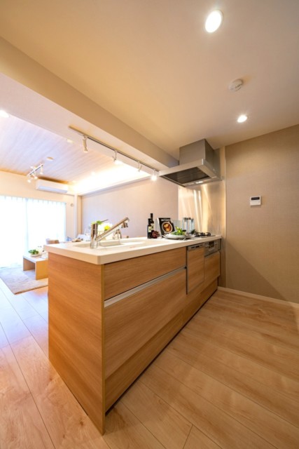 お部屋の雰囲気に合わせた木目パネル使用の調理台。下には引き出しタイプの収納と食器洗浄乾燥機が入っていました。引き出しタイプは沢山詰めても出し入れがしやすいのが特徴です。食洗機に洗い物をお任せすれば、食後はみんなでのんびり出来ますよ♬ カウンターキッチンの一番のメリットは、やはりお料理中のコミュニケーションの取りやすさだと思います。会話をしながらお料理なんていいですよね(^^)