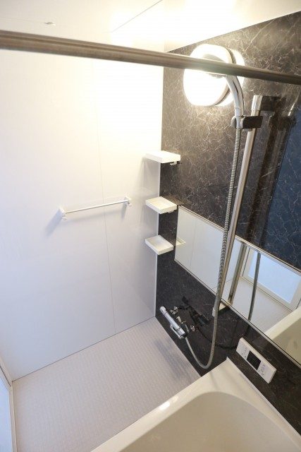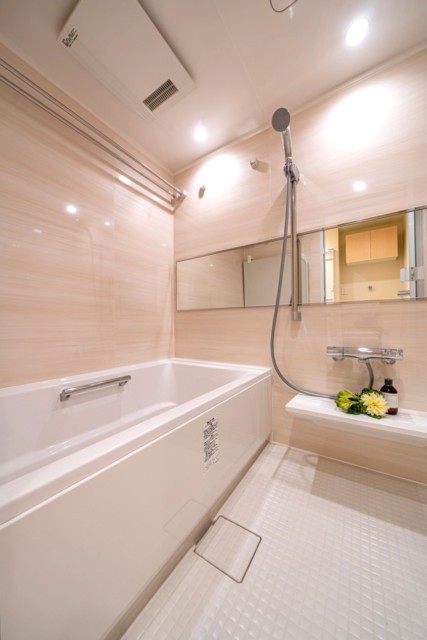 浴室は白とベージュの柔らかい雰囲気。リラックスしてバスタイムを過ごせそうですね。追い焚き機能付きなので、ご自分の好きな時間にお風呂に入る事が出来ます。長風呂したって大丈夫ですよ(^^)浴室換気乾燥機は浴室の換気の他に、お洗濯物乾燥や浴室暖房など様々な使い方があります。雨降りの日でもお洗濯可能ですし、花粉やPM2.5などが気になる方にもお勧めです。