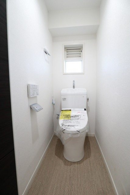 トイレには吊戸棚と温水洗浄便座付き。トイレットペーパーなどをトイレ内にストック出来て、いざという時に助かります。