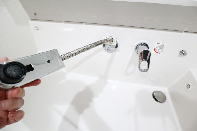 一体式のボウルでお掃除ラクラク、水栓はシャワーヘッドになるのでここで頭も洗えます。