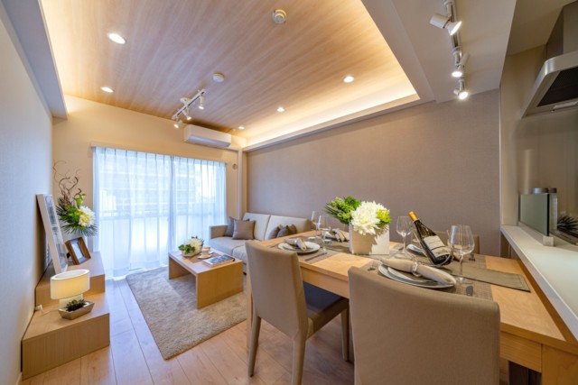 こちらはリビング・ダイニング・キッチン。南東向きのバルコニーに面した縦長のお部屋です。縦長のお部屋はレイアウトしやすいのがいいですよね。スポットライトやダウンライト、間接照明など様々な照明が使われていて照明へのこだわりも感じられます。