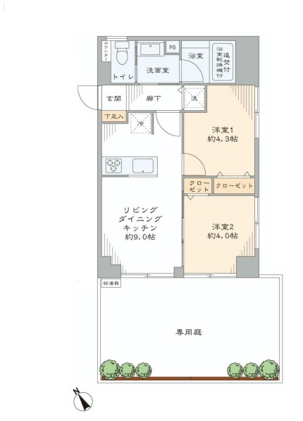間取りのご紹介です。2LDK、42.40㎡。1階の角部屋。陽当り良好な専用庭もついています。