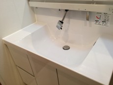 廊下を進み、左手に水回りを一か所に集めたサニタリールームがあります。少しだけですが、段差がありますのでお気を付けください。左手にトイレ、正面に洗面台、右手にバスルームの並びです。