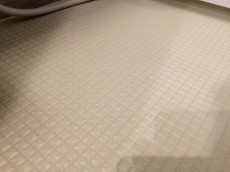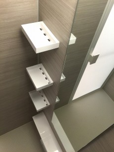 縦長ミラーの横と下には棚も付いているので小物を置くスペースもあります。モザイクパターンの床は、水はけが良く、すばやく乾燥します。