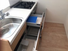 キャビネットはスライド式なのでキッチングッズの収納も楽々 (●´∀`)配管を気にせず収納できるので大容量。対面式のキッチンですので、上部に収納はありません。