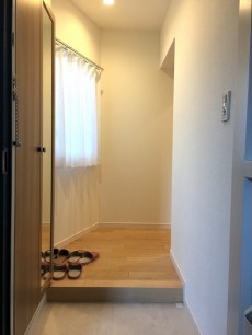 扉を開けると フルリノベーションを終え綺麗に生まれ変わった玄関です☆左手に見える窓から光が差し込む明るい雰囲気♫角部屋は開口部が多いので嬉しいです。人感センサーがついているので、人が通ればパッと電気がつきます。消し忘れもなく経済的です。