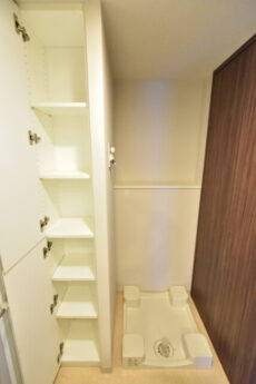 収納は種類が豊富で、大きなものから細かなものまでバランス良く収納することができそうですね。洗濯機スペース奥のニッチには洗剤などをどうぞ。