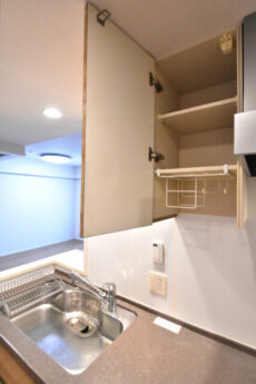 収納は調理台下のスライドキャビネットと吊戸棚。スライドキャビネットは開口部が大きく出し入れがしやすいのが特徴です。奥の方まで無駄なく使えるのが有難いですよね。吊戸棚の下部は吊るしたりできるよう底が付いていません。
