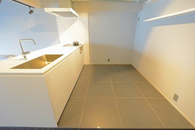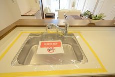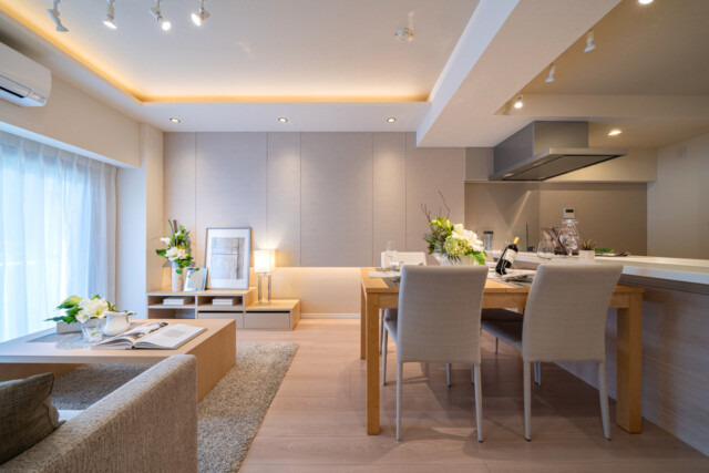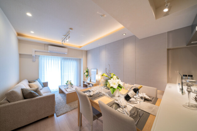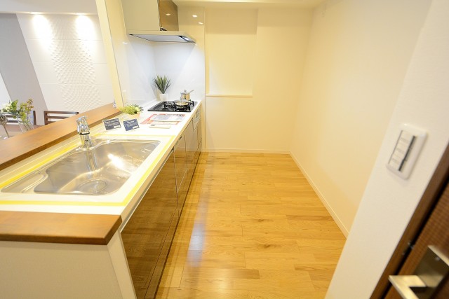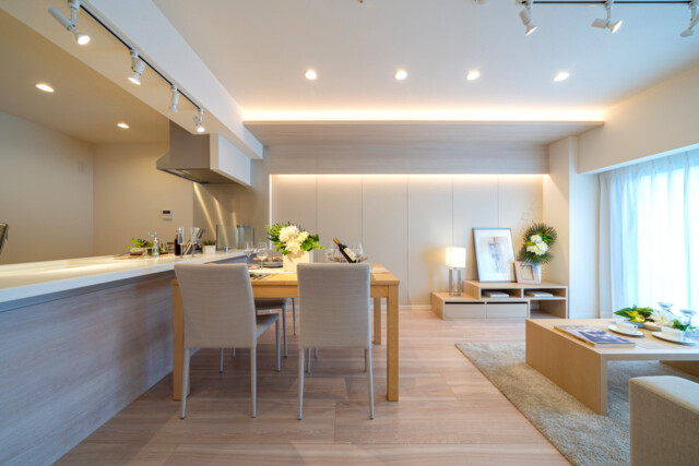 南東向きバルコニーに面した明るいお部屋です。入口からキッチン、ダイニング、リビングと縦に並べるオーソドックスなタイプなので、家具のレイアウトに悩むことはなさそうですね。置いてある家具はディスプレイ用なので付いてはきませんが、サイズや色、素材感などの参考にさせてもらいましょう!