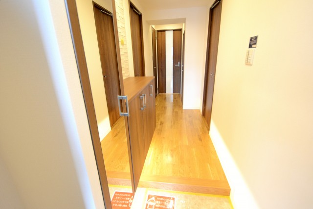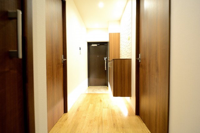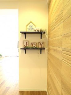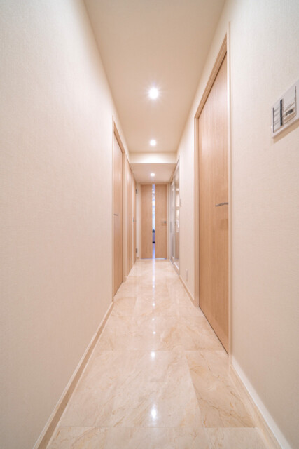 玄関廊下は高級感のある大理石仕上げ。冷たくなりがちな石素材ですが、木目と合わせた柔らかな色合いで温かみのある雰囲気になっています。玄関の照明は人感センサー付きなので暗い中手探りでスイッチを探すなんてこともありません。いつでも明るい玄関が迎えてくれるのは嬉しいものです。