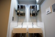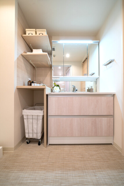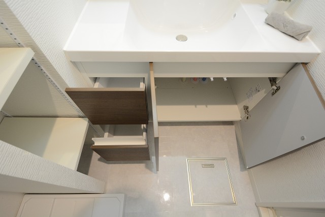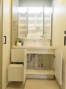洗面台もスライド式棚と開き戸タイプに分かれているので