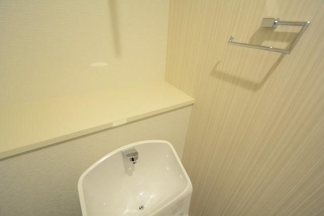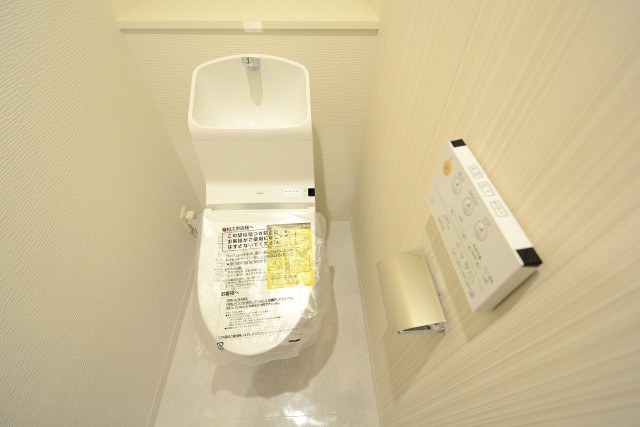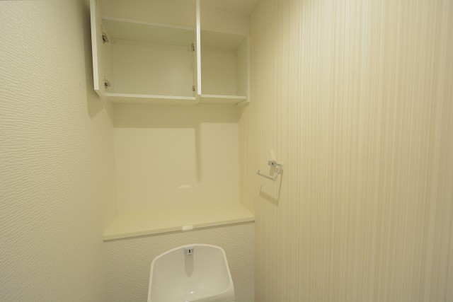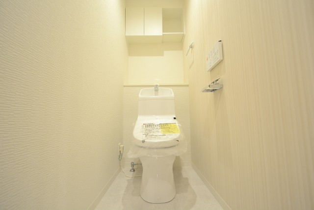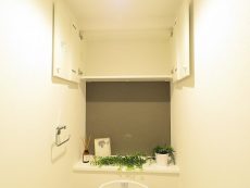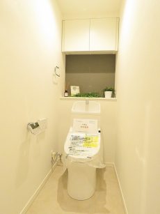 トイレはTOTO製の温水洗浄機能一体型。トイレットペーパーのストックや掃除道具などの収納に便利な吊り戸棚も付いています。