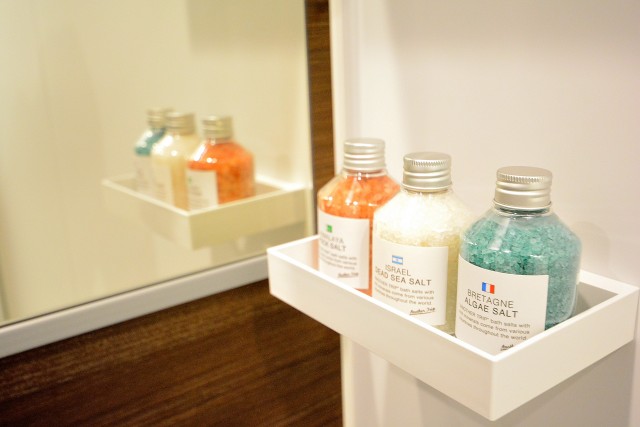壁や天井は立体的に造作され、裏に付けられた照明が奥行きのある広がりを感じさせてくれています。シンプルな色使いな中、ダウンライトやスポットライトがいいアクセントになっていますね。
