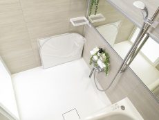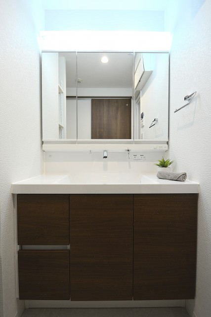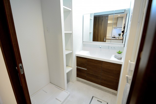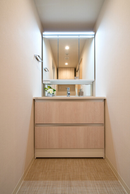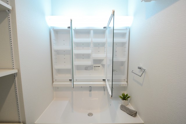洗面室には洗面化粧台の他に洗濯機スペースと浴室がまとまっていて脱衣室も兼ねています。洗面化粧台は身だしなみを整えるのに便利な三面鏡付き。裏がキャビネットになっているので、洗面周りに散らかりがちな細々したものもスッキリと片付けることができますよ。ランドリー用品は洗濯機スペース上の吊り戸棚へどうぞ。