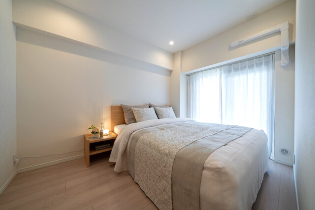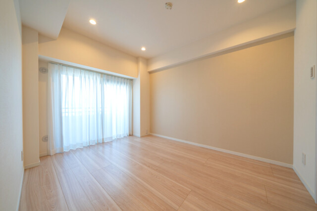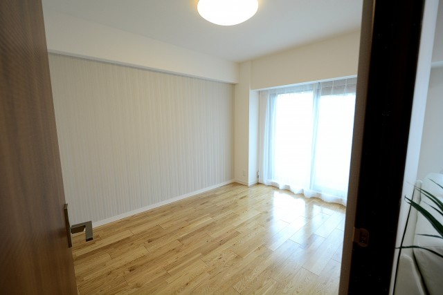 LDKと同じバルコニーに面しています。この洋室には大きなウォークインクローゼットが付いているので、外に収納家具を置く必要はありません。内装はシンプルな色使いで家具やカーテンも幅広く合わせることが出来そうです。