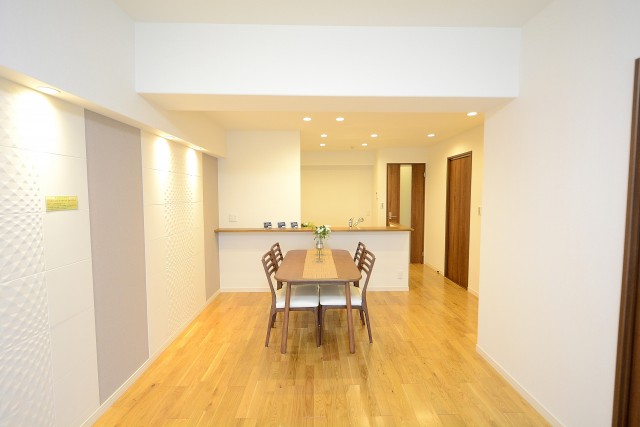 バルコニーに向かってカウンターキッチン、ダイニング、リビングと並ぶオーソドックスなレイアウトです。結局、これが使い勝手が良かったりするんですよね。LD部分は4人掛けダイニングテーブルとソファーセットを置いても余裕のある広さがあります。