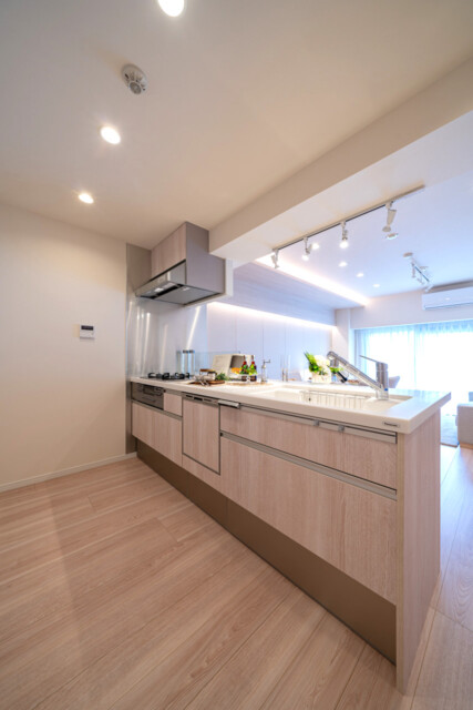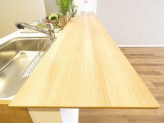調理台はフローリングとの統一感のあるパネル使用で、お部屋の雰囲気に溶け込んでいます。浄水機能一体型水栓や食器洗浄乾燥機付きなど機能も充実。食器洗浄乾燥機は嬉しいですよね~。洗い物はお任せして、食後はみんなでのんびりしちゃいましょう♬