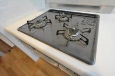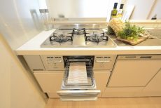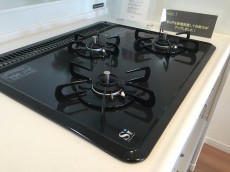 コンロは3口のグリル付きガスコンロです。両面焼きのグリルが付いているので、お肉もお魚も美味しくこんがり焼きあげることが可能です。