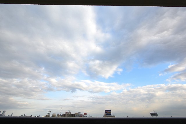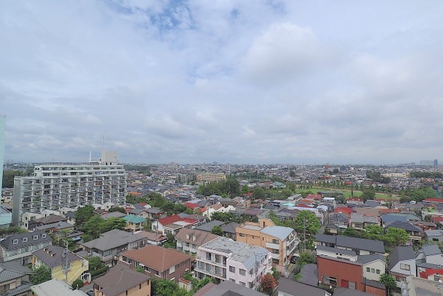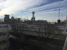 バルコニーから右手に甲州街道があり、目の前は路地になっているので、車の通りが少なく、穏やかな景色が広がります。目の前の建物が低いので、青い空を見る事ができました☆