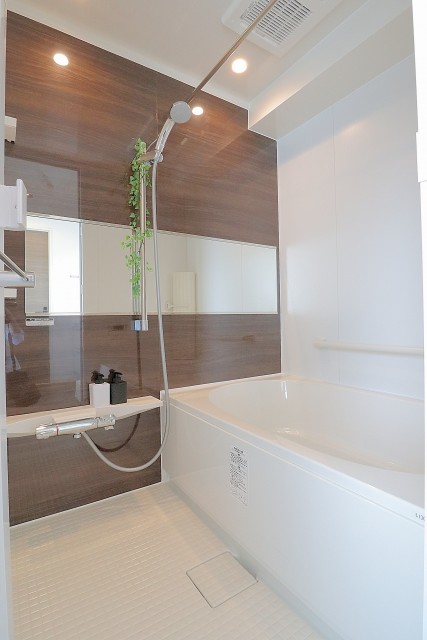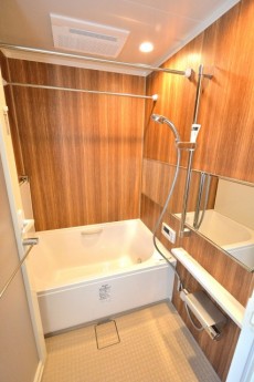 バスルームは、落ち着いた木目調のパネルを使いシャープな印象のバスルーム☆ゆっくり大きなバスタブにつかって疲れを癒せそうです♪もちろん追いだき機能付きです♪♪