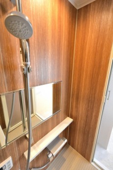 バスルームのパネルも木目調で、本当の木ではありませんが、どことなく温もりを感じさせてくれるデザインです(^v^)