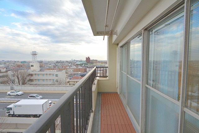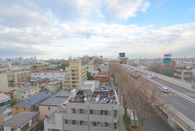 お部屋の南側には甲州街道が走っています。下の5階の高さの所には、首都高も。二重サッシで騒音対策はなされていますが、やはり少し音はします。
