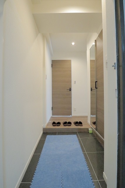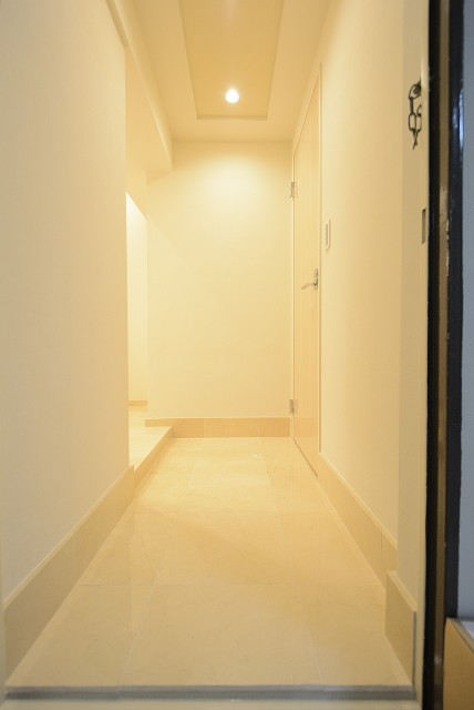 玄関を開けると、 フルリノベーションを終え綺麗に生まれ変わった玄関がお出迎えです☆廊下が一直線に続きます。玄関照明は人感センサーになっているので節電はもちろん夜間のお帰りの際も便利です。
