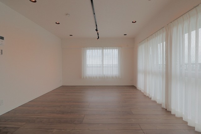 広さは約13帖。マンションの角に位置しているお部屋なので2面に窓が付いています。撮影に来た日は曇りだったのですが、晴れていれば明るい空間になりそうです。