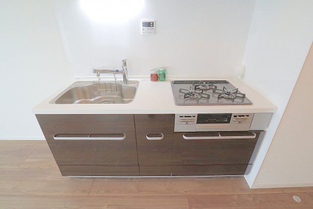 3つ口コンロはお料理好きの方には嬉しいですね♪人造大理石のワークトップ&シンクは大きめです(o´∀`ノ