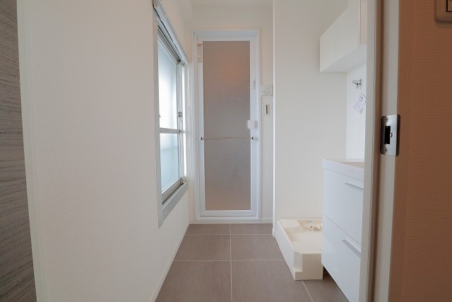 廊下の左側にサニタリールームがあります。北側に大きな窓が付いているので、室内はとても明るいです☆でもこれだと脱衣所としてはお使い頂けないので、目隠し用のカーテンに取り替える事をオススメします(*^^)v