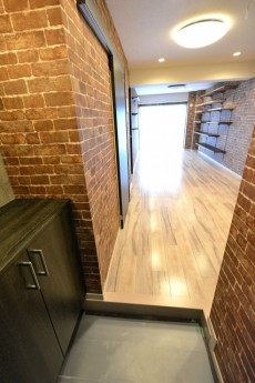 玄関を開けると、先程の建物の雰囲気とはガラっと変わった、こだわりのデザインのお部屋がひろがります。お部屋の壁がほとんどレンガ造り(の様に見えるクロスです)になっています。