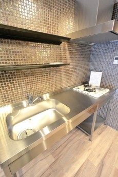 キッチンはステンレス製でお店の様です。正面に収納棚が2段付いていますので、スッキリと片づけられます(^o^)