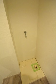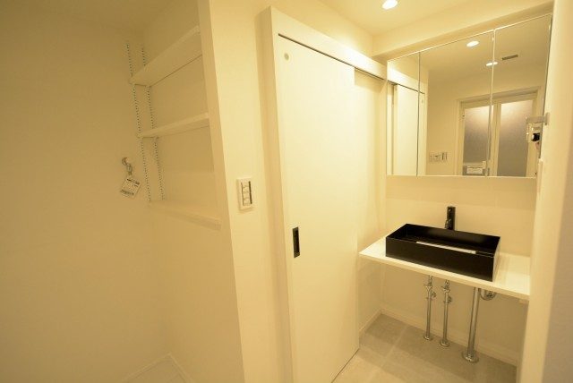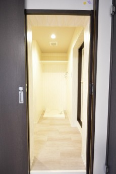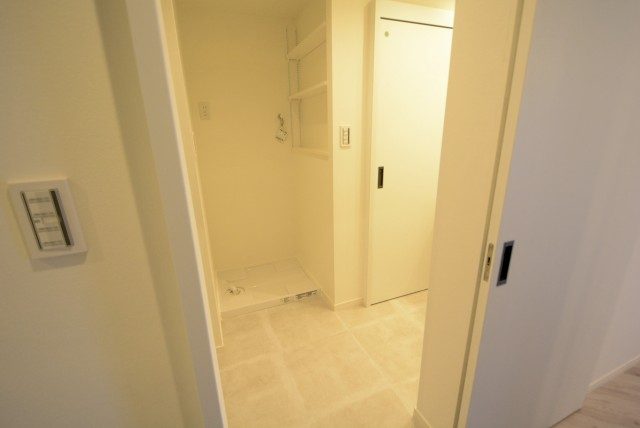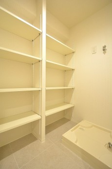洗濯機置場には収納棚がありません。上部が開いているので、棚を取り付けてスッキリ収納してください。