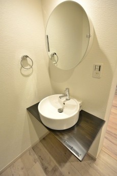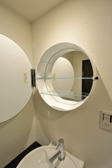洗面台はシンクも鏡も丸型でオシャレで可愛いデザインです。丸井鏡の裏側が収納になっていて、こちらも鏡になっているので、扉を開けたままお化粧ができて便利です(*^^)v