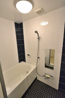 バスルームは白と青のアクセントがとても綺麗なタイル貼りです。お部屋の中と雰囲気が違いますが、ちょっとレトロな感じが、逆にステキです☆