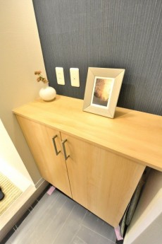 玄関左側に腰高のシューズボックスがあります。カウンターにはお部屋の雰囲気に合ったオブジェ、フィギュア等を飾っておくと、更にカッコ良くなりそうですね(*^。^*)