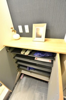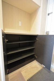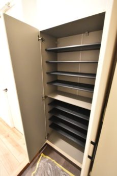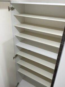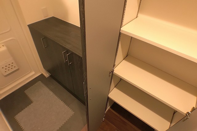 人感センサーが自動的にライトを点けてくれるので、真っ暗な中手探りでスイッチを探すなんてことももうありません。暗いお部屋に帰って来るのって寂しいもんですよね^^;)シューズボックスはトールタイプ。収納力抜群!棚を調節すればブーツなどでも立てて収納可能です。