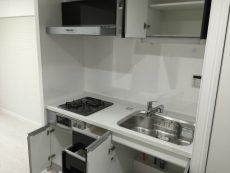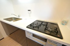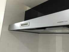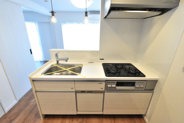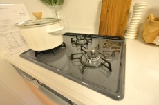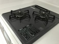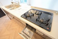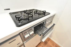 コンロは3口、グリルも付いています。調理の臭いって後になってから気になりますから、調理中は換気扇をお忘れなく!少し前から回し始めると効果的らしいですよ。