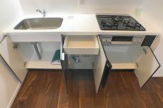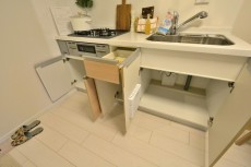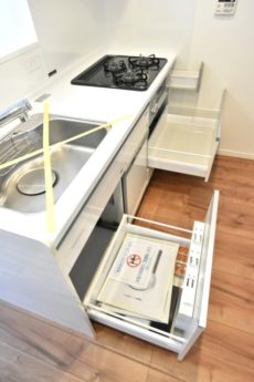 調理台の下にはスライドキャビネットと食器洗浄乾燥機。引き出しタイプのスライドキャビネットは出し入れがし易く、たくさん詰めても収納物の確認がしやすい優れものです。食洗機付なんですね!!これからの寒い季節に食器洗いから解放されるなんて夢のよう。余った時間でゆっくりコーヒーを淹れたり…と妄想が広がります(*´▽`*)