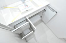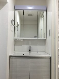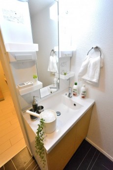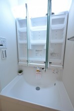 洗面台はシャンプードレッサータイプで三面鏡裏収納もあり機能的です。