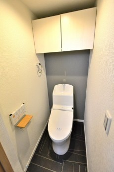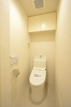 シンプルでいい感じですね。トイレットペーパーなどのストックに便利な吊戸棚が付いています。洗浄便座はINAX製のシャワートイレ。