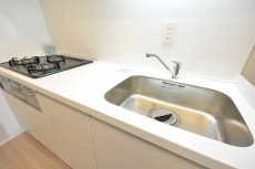 大きめのシンクには浄水器水栓が取り付けられています。3口コンロが設置されているので、お料理がはかどりそう♪