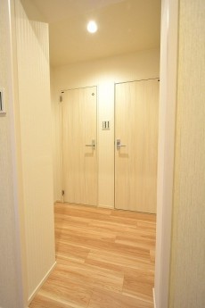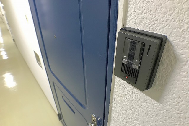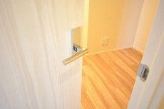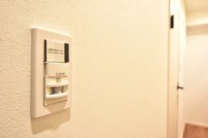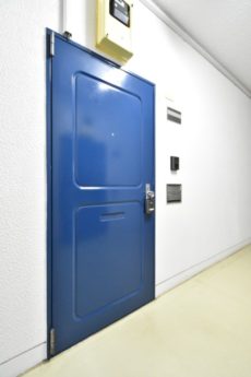 玄関ドアは秀和のイメージカラーのブルー。ドア横にはモニター付きインターホンが設置されていて、お部屋の中から訪問者を確認する事が出来ます。映像を見てから応対するかを決められるので安心ですね。ドアスコープもありますが、向こうからも見られている気がしてなんか苦手です^^;)
