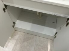 収納は洗面台下と三面鏡裏のキャビネット。細々した物が多くなりがちな洗面廻りには、豊富な収納は有り難いですね。いろいろなタイプがあって、大きな物から細かい物までバランスよく収まりそうです。三面鏡ですが、外側に開くので残念ながら後ろを見たりは出来ません^^;)