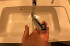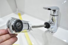 水栓はハンドシャワータイプ。ノズルが伸びて洗面ボウルを流したりに便利です。