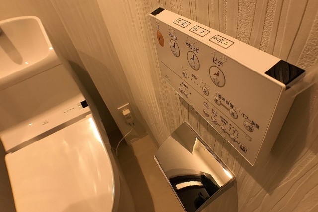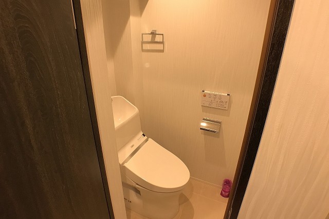 トイレにはペーパーホルダーの上に小さなカウンターがあります。トイレに持って入った物を置ける場所があるととても便利です♪