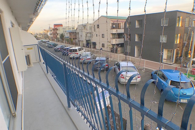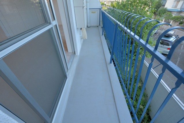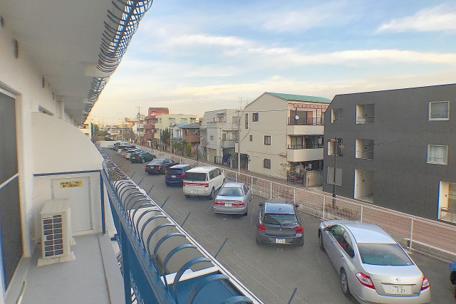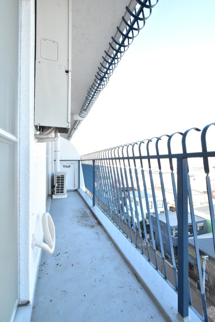南東向き。二部屋分の幅がある、手すりが下まで柵になった開放的なバルコニーです。私もそうですが、高い所が苦手な方は少し怖いかもしれませんね^^;)