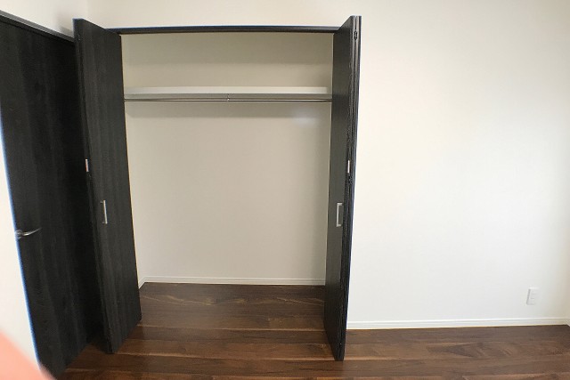 収納は間口が広くて使いやすそうなクローゼット。部屋幅いっぱいを使った大きな収納です。奥行きもあるので、キャリーバッグやスーツケースなどの大きな物も余裕で入りますし、衣装ケースなどで収納力をアップさせるのもアリですね。