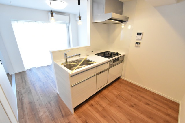 壁付けタイプのキッチンでお部屋を広く使いうことができます。